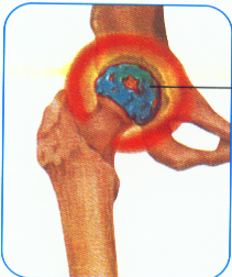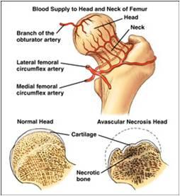 Avascular necrosis is the result of a loss of blood supply to the ball or head of the femur bone. As a result, articular cartilage wears away leaving a "bone on bone" grinding and pain during hip joint movement. It is the commonly seen in younger age patients following alcoholism, steroid oversuse, accident and hip injury etc.